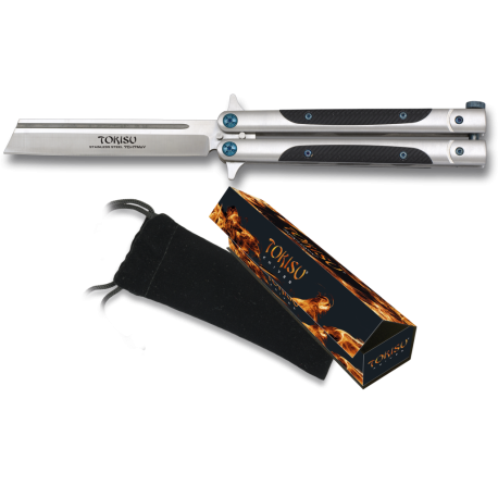 - 7CR17MoV, et kinesisk stål som ligger nær 440A. Legg merke til at du kan se Tokisu-logoen på bladet, med ståltypen som er brukt rett under. Det er til og med mulig å gravere bladet med teksten du ønsker ( se knappen nedenfor ). Til informasjon er bladets tykkelse nøyaktig 3,8 mm. På håndtakssiden er det laget av stål og G10 for eleganse til enhver tid: en kontrast som bare er sublim! I tillegg til å være estetisk tiltalende, er håndtaket like komfortabelt og transportabelt som alltid (lengde 135 mm ): Tokisu 02174 butterflykniv glir uanstrengt ned i lommen din. Denne balisongen er designet i Spania, og leveres til deg med sin beskyttende, svarte fløyelsslire, noe som er svært praktisk når du er på reise og på farten. Leveres i dekorert eske med magnetisk lukking ( jf. produktbilde ).